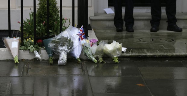 Flores em homenagem a Margaret Thatcher, vistas nesta terça-feira (9) em frente à antiga residência dela em Londres (Foto: AFP)
